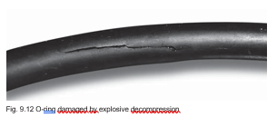 Since all elastomers are permeable, pressurised gases will per- meate the sealing material. The higher the pressure the more gas is pressed into the seal. If the ambient pressure around the seal is reduced quickly, the gas inside the seal will expand and escape, or there will be a formation of blisters. Some of these blisters may burst and damage the surface. This process is called explosive decompression. A seal’s susceptibility to dam- age depends, for example, on pressure, decompression time, the type of gas, type of compound and the o-ring cross-section. Damage rarely occurs below 30 bar. Generally, CO2 gas is more likely to lead to blistering and surface destruction than nitrogen, yet any compressed gas may cause this type of surface destruc- tion after sudden decompression (figure 9.12)