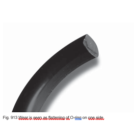 Another O-ring failure is caused by dry running. The O-ring sur- face is characterized by a spiral mark which eventually develops into a deep cut causing failure (see Fig 9.10 and 9.11).