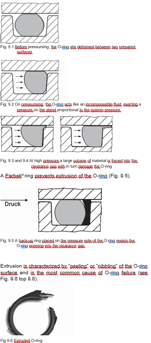 The pressure ranges given by the extrusion diagram (Fig 8.6) have been obtained by experiment and give important hints as to when it is necessary to use backup rings. See figures 9.1, 9.2, 9.3 and 9.4.