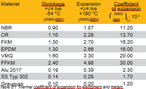 According to the recipe, elastomers show a coefficient of a thermal expansion near a factor 10 times greater than that of steel. It is therefore important in borderline cases to know how much a seal shrinks in cold condition or expands at high temperatures and how this affects the elastic force on the seal face. At low temperatures, a reduced elastic force on the seal face can lead to leakage when additional shrinkage occurs. In dynamic applications, the additional heat generated due to friction can lead to increased force as the seal expands (provide for sufficient material as a heat sink!).