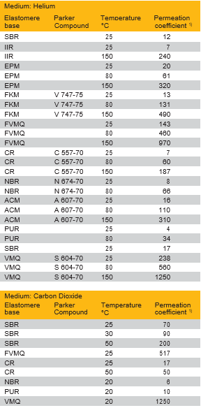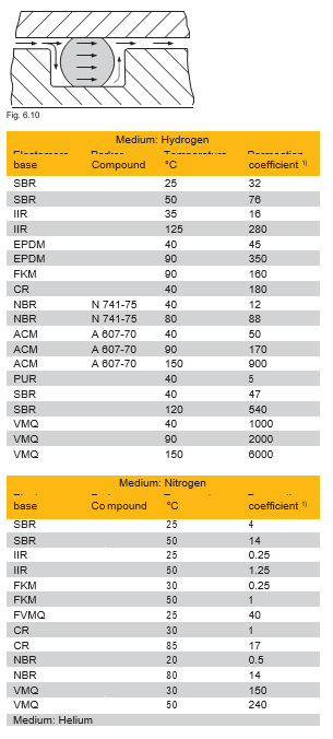 All elastomers allow gas to enter their structures, to permeate through and leave at the low-pressure side. The rate of permeability through an elastomer depends on the type of gas, elastomer base, temperature and pressure difference. The permeability rate is of great importance in the vacuum and gas industries (see Section 7.12). Calculation of the rate of gas permeation The rate of gas leakage through an O-ring can be calculated as an approximation when the elastomer permeation rate and the working temperature are known. Table 6.4 gives various gases with their gas permeability coefficients. The following formula can be used to calculate an approximation: