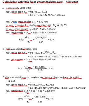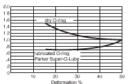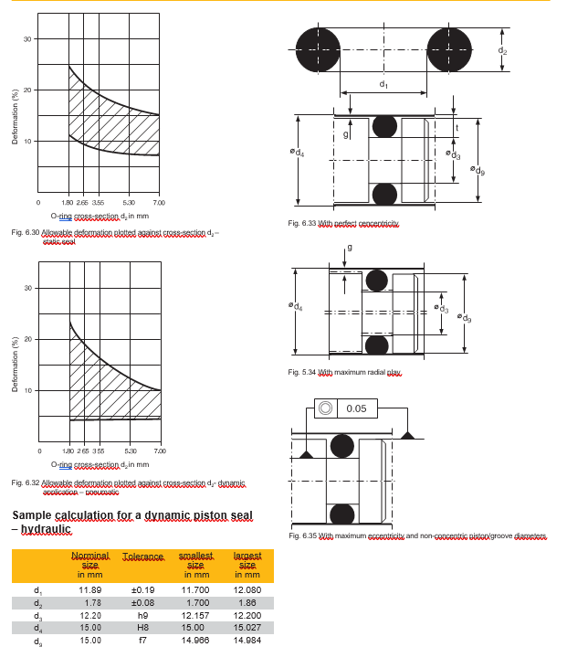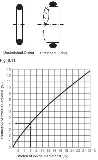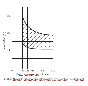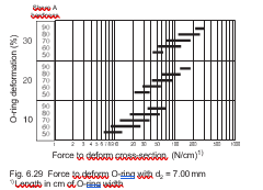 The minimum allowable deformation depends upon the type of application. A low deformation can lead to a 100% compression set in a very short time. When the deformation is too high it leads to a high compression set. In dynamic applications high deformation leads to increased fric- tional forces and higher temperatures. The characteristic curves shown in Fig: 6.30 to Fig. 6.32 take into account elongation, cross-section reduction and metal toler- ances for seals under normal conditions. In special cases minimum deformation also is effected by over- stretched rings, influence of temperature, breathing of cylinders, eccentricity, etc.