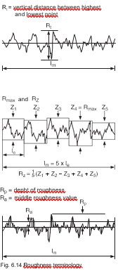 Roughness terminology). Rt is the vertical distance be- tween the highest and the lowest peaks in a roughness profile over a test length lm. Rt is increasing, being replaced by Rmax, the maximum depth of roughness. Rmax is the greatest single roughness found in 5 consecutive single trace lengths le. This is given in Fig 6.14 by the roughest profile Z4. In this case Z4 = Rmax does not include extreme roughness peaks as is the case of Rt.
