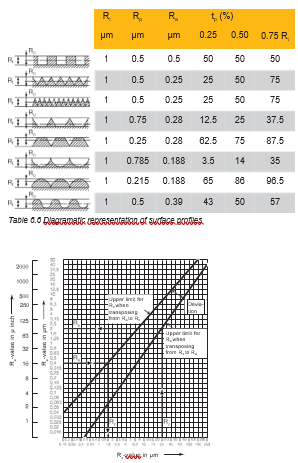 The middle roughness value Ra is an arithmetic mean of all components of the roughness trace within the trace length lm. Rz, he average roughness value of 5 consecutive trace lengths le is often preferred to Ra. If Ra is known, Rz can be taken from Fig 6.15 and vice versa. Fig is taken from DIN 4768, part 1, attachment 1. Should Rz reach the upper portion of the graph it can be assumed that the specified Ra values will not be exceeded. The lower limits would Finally, the depth of roughness Rp also is of interest and is the vertical distance between the highest point on the roughness trace and the center line of that tracebe taken if a Rz value should be specified.