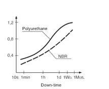 As in many other areas break-out frictionof elastomers is significantly higher than running friction. Apart from compound type and seal geometry, tendency to adhesion, deformation, the down-time and the surface finish play a role in increasing break-out friction. The longer the down-time, the more lubrica- tion is squeezed from between the seal and the running surface resulting in a non-lubricated vacuum. In this condition the level of starting friction approaches that for dry friction and is up to 10 times that found in running friction (Figs 6.18 and 6.17). For the same conditions, friction at high temperature (= low vis- cosity) is high because the lubricating film is often interrupted.
