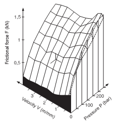 Running velocity is a product of seal friction, the piston mass and the load. Of all these factors, only friction can be influenced and makes for a better relationship between sealing surface finish, lubricating film and surface finish running very important. Cer- tain improvements can be made making the system stiffer, this means the smallest possible oil volume under pressure on the hydraulic side.