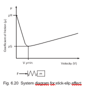To assist in the explanation of the term stick-slip, please refer to Fig 6.20. To accelerate a mass m from zero to maximum veloc- ity, the break-out friction µH must be overcome by F1. The spring element is loaded with F1 and with increasing velocity the friction value µH reduces to µG and the force to F2 The potential energy stored in the spring accelerates the mass even further. When the stored energy is used, the mass is decelerated by the increasing friction in direction µH. This requires once again an increase in the force level of F1, and the procedure repeats again.