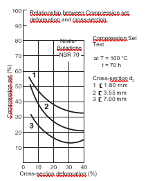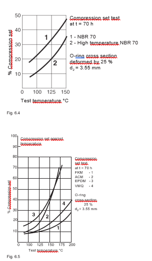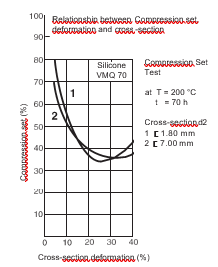 It can be seen that the compression set of NBR compounds is in- fluenced by the cross-section of the specimen to a higher degree than with VMQ (Silicone) compounds (see Figs 6.2. and 6.3). The compression set is minimum at 25 % to 30 % deformation.