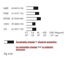 Elastomers lose their flexibility with increasing levels of radiation. Radiation is a medium which causes breaking down of the poly- mer chains which form the elastomer. The cross-linking process quickens under increasing radiation dosage, tensile strength and elongation at break decrease, hardness and modulus increase. The elastomer also becomes brittle. Conversely butyl rubber IIR becomes soft and sticky. In general terms elastomers have resistance to radiation levels of 1 M rad = 106 rad without losing their elastic properties. 1 M rad is a dosage level which normally would be reached after years of operation. At 10 M rad (= 107 rad) the physical proper- ties are effected. The change in compression set is certainly the most important property affected by increased radiation. The most suitable compound is EPDM. An elastomer normally is exposed to other media in addition to radiation, e.g. water, steam, oil, air and chemicals. These sec- ondary media often are of primary importance because extreme temperatures, e.g. +150°C in steam, may cause seal failure after very short time.