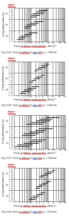 The force necessary to deform an O-ring cross-section by a given amount (in percent) is related to the compound modulus and O-ring geometry. Normally the user knows the compound hardness and the deformation in percent, the following diagrams (Fig. 6.25 to Fig. 6.29) show the relationship between hardness, deformation and cross-section.