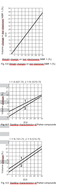 The effect does not only depend on the construction of the elastomer but also the hydraulic fluid. The base elastomer contains between 15 % and 50 % acryl-nitrile (ACN). The higher the ACN content, the better the compatibility with oil. In the same way, high content of aromatics (e.g. as in paraffin based oils) leads to a low tendency to swell (also with low ACN content). Conversely, naphthene based oils cause swelling which for some elastomers does not tend to reach equilibrium, e.g. with NBR. A high ACN content is necessary to resist swelling resulting from naphthene based oils. To select the correct compound without carrying out extensive laboratory tests we have developed a simple reference test called ECI (elastomer compatibility index). Countless tests have proved that there is a linear relationship between the ECI and the volume change of elastomers based on NBR, ACM, FKM and CR rubbers. By using the ECI, the volume change of the above elastomers can be predicted in a mineral oil thus saving valuable laboratory time. The ECI for oil is initially determined in the laboratory (see also Table 6.2). The ECI values can be plotted on a compound specific graph (Figs 6.7. and 6.8) and the expected volume change can be read directly from the vertical axis. In this way, a decision can be taken regarding elastomer compatibility with oils. Our procedure now has been standardized under international standard ISO 6072. On request, we are pleased to test any oil to determine its ECI. However, anybody can test for the ECI as follows: The weight change of a test elastomer, e.g. NBR 1 to ISO 6072, is measured after immersion in the respective oil for 168 hours at +100 °C. The ECI then is simply read from Fig 6.6 plotting the weight change.